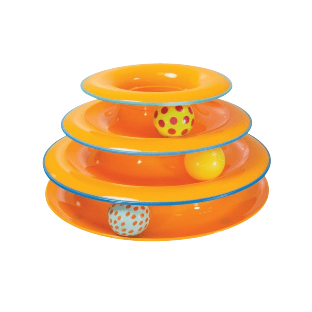 1. Petstages Tower of Tracks – Torre de três níveis com bolinhas que giram e rolam, ideal para perseguir e estimular o instinto de caça.