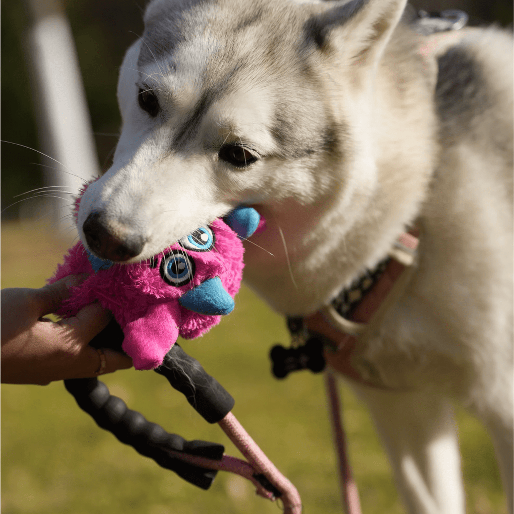 Além do som, a textura da bola massageia levemente a boca do cão, criando um segundo nível de interação.