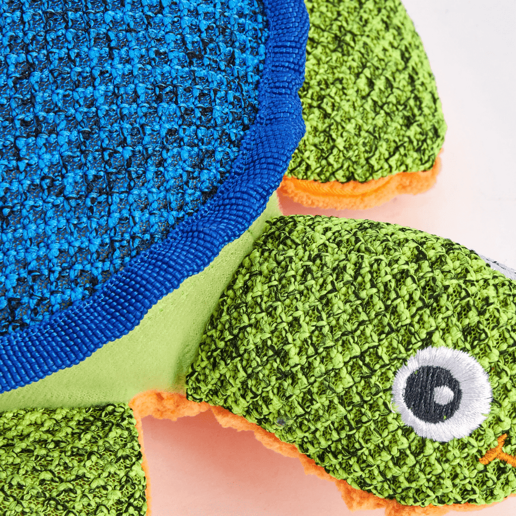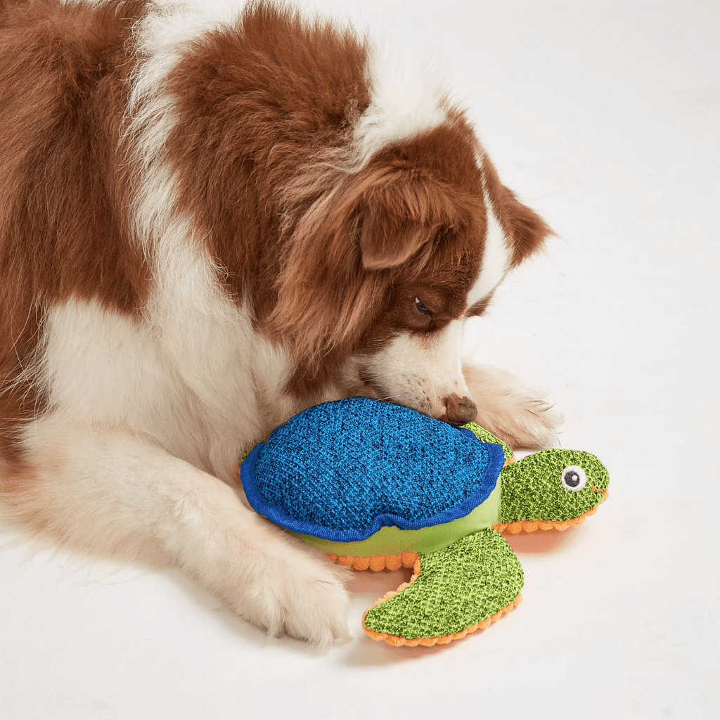 Ofereça a tartaruga em sessões de brincadeira supervisionada. Ideal para apertar, morder levemente e interagir com o som do squeaker. Nunca deixe o brinquedo sozinho com o cão sem acompanhamento.